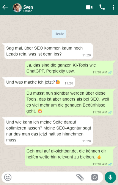 „Wir sorgen dafür, dass Kunden dich in ChatGPT, Perplexity & Co. finden - für mehr Anfragen, mehr Umsatz und weniger Risiko